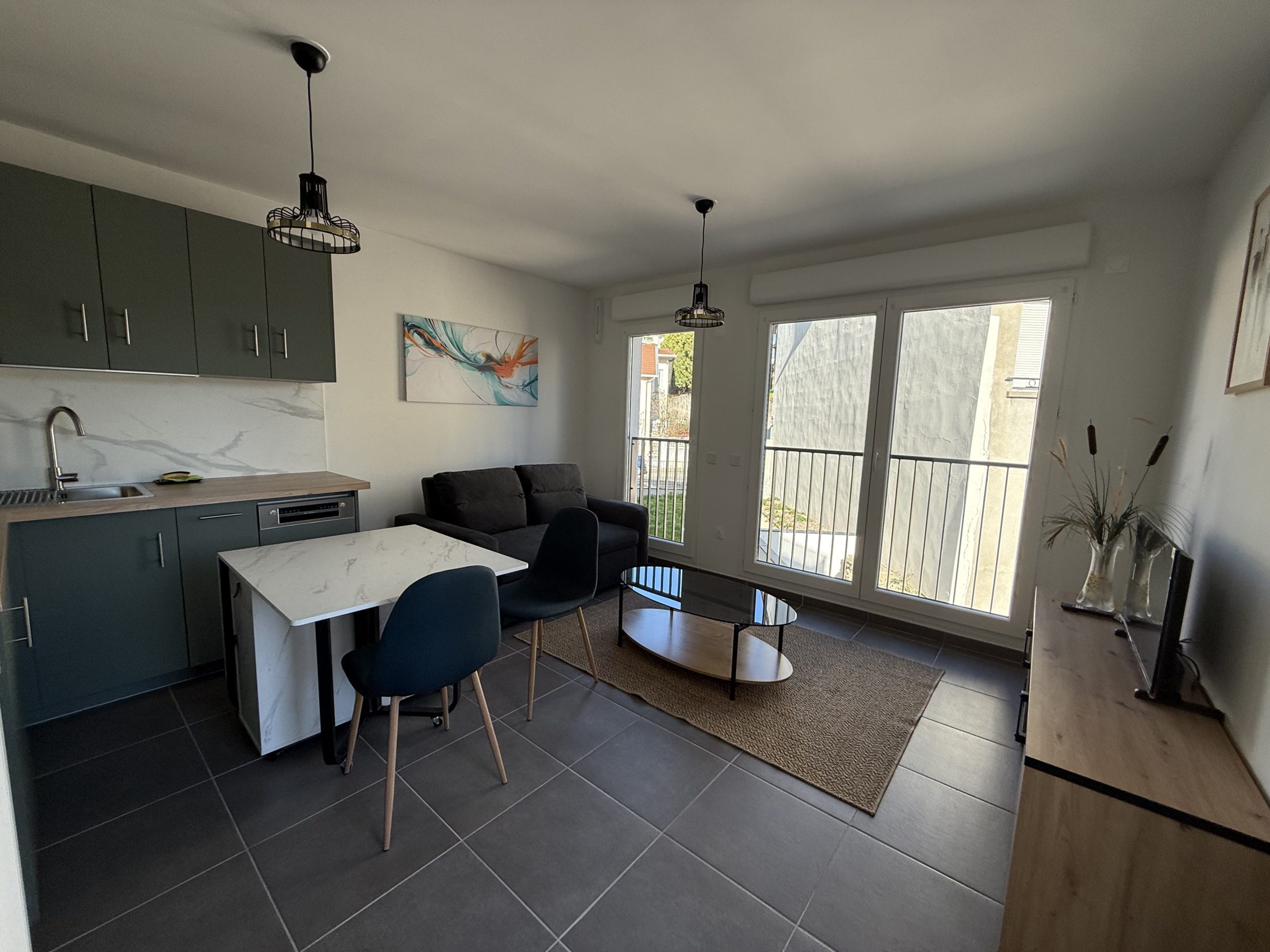 Une entrée, une pièce de vie lumineuse avec cuisine ouverte entièrement équipée et aménagée (meubles, four, plaques, hotte, réfrigérateur, lave-linge, lave-vaisselle), un accès au balcon, une chambre avec rangements et bureau, une salle d’eau avec douche et un WC indépendant.